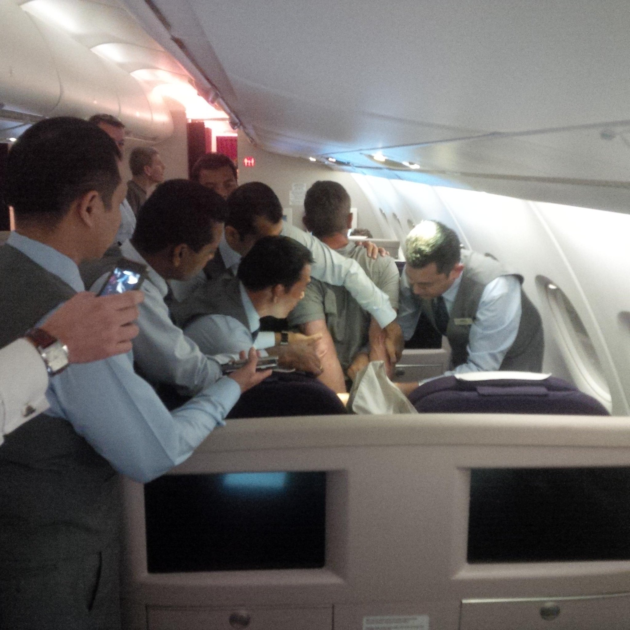 At this point 6 crew pinned him down, cuffed him, tied his legs and strapped him in a seat.