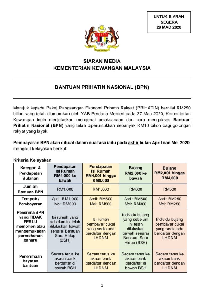 Siaran Media @MOFmalaysia Berkenaan Pembayaran Bantuan Prihatin Nasional (BPN) akan dibuat dalam dua fasa iaitu pada akhir bulan April dan Mei 2020.