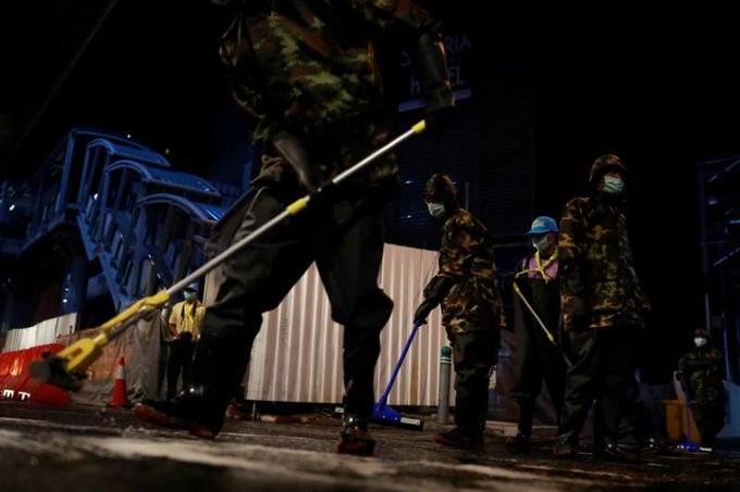 Royal Thai Army soldiers sanitize in the city due to the coronavirus disease (COVID-19) outbreak in Bangkok, Thailand March 21, 2020. REUTERS/Soe Zeya Tun