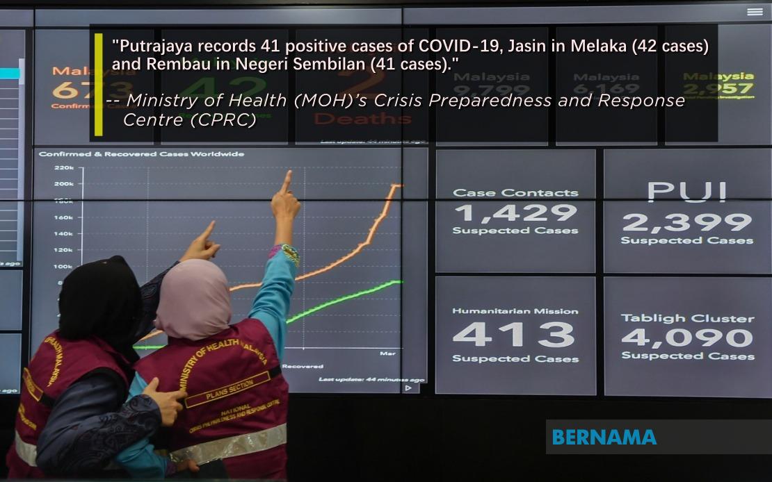 According to statistics released by the Ministry of Health (MOH)’s Crisis Preparedness and Response Centre (CPRC) on Twitter today, Putrajaya recorded 41 positive cases of COVID-19, Jasin in Melaka (42 cases) and Rembau in Negeri Sembilan (41 cases)