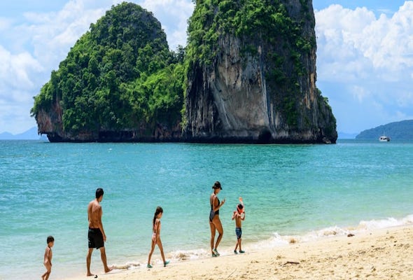 Tourists walk along Phra Nang beach in Krabi. Thailand will resume its quarantine-free travel scheme from February 1, 2022. - Mladen ANTONOV / AFP