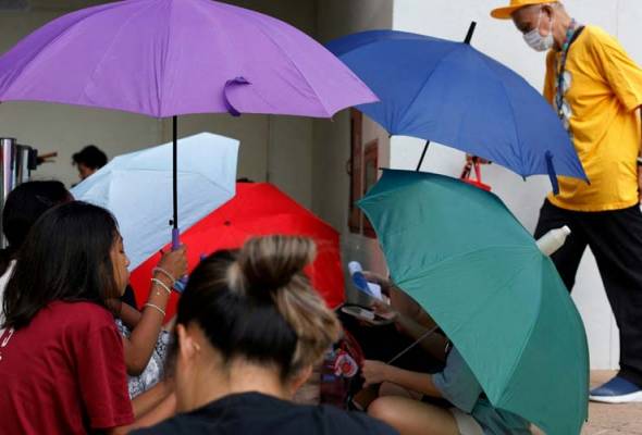 Maria Alia, 15, and her friends seek shade from the sun under umbrellas as they queue for Taylor Swift concert tickets in Singapore July 7, 2023. - REUTERS