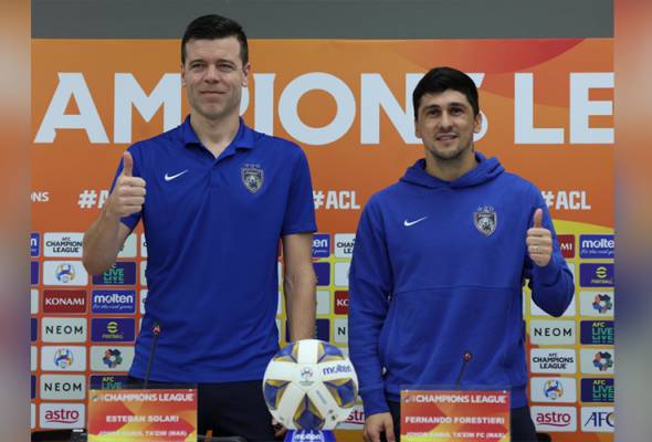Esteban Solari dan pemain JDT Fernando Forestieri (kanan) ketika sidang media menjelang perlawanan ACL JDT melawan Ulsan Hyundai FC di Stadium Sultan Ibrahim hari ini. - Gambar Bernama