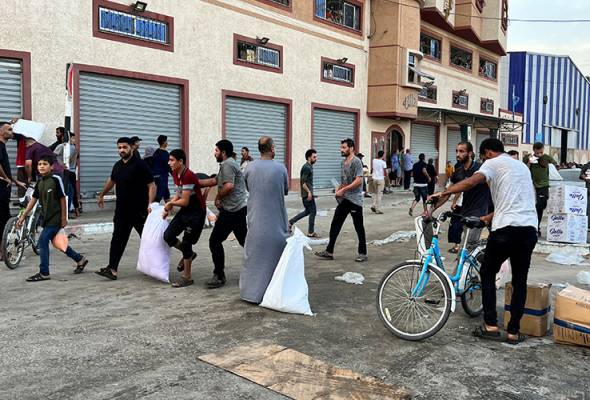Palestinians carry food supplies near a United Nations Palestinian refugee agency (UNRWA) run warehouse in Khan Younis in the southern Gaza Strip. - REUTERS