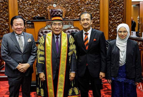 Yang Dipertua Dewan Negara Datuk Mutang Tagal (dua, kiri) bergambar bersama tiga Ahli Dewan Negara yang baharu mengangkat sumpah jawatan di Bangunan Parlimen hari ini. - Foto Bernama