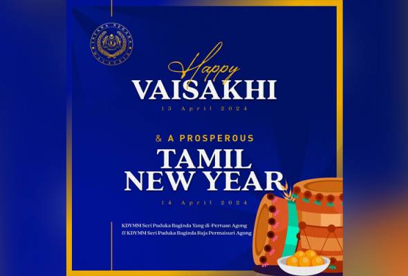KUALA LUMPUR: Yang di-Pertuan Agong Sultan Ibrahim dan Raja Permaisuri Agong Raja Zarith Sofiah menzahirkan ucapan selamat menyambut Hari Vaisakhi dan Tahun Baharu Tamil kepada semua masyarakat Sikh dan Tamil di negara ini.