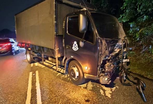 Keadaan trak polis yang bertembung dengan sebuah kereta dalam kejadian di Jalan Bukit Cerakah, Klang, pagi ini. - Foto JBPM Selangor