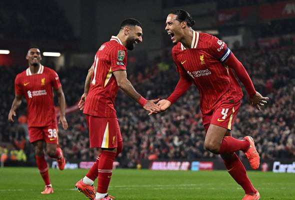 Virgil van Dijk (right) and Mohamed Salah celebrate scoring the team's fourth goal during the EFL semi-final match between Liverpool and Tottenham Hotspur at Anfield, Liverpool, Britain, Feb 6, 2025. -REUTERS