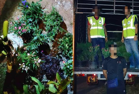 Kiri, sebahagian daripada lebih 2,000 anak pokok bunga pelbagai jenis yang dipercayai diseludup dari Thailand. Kanan, pemandu lori yang ditahan. - Foto Facebook Briged Tenggara PGA Rasmi