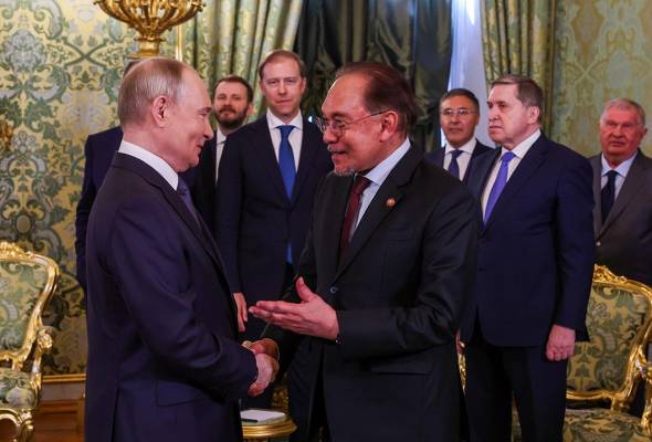 Prime Minister Anwar (right) shakes hands with President Putin during a bilateral meeting at the Kremlin, Moscow on Wednesday. - Bernama photo