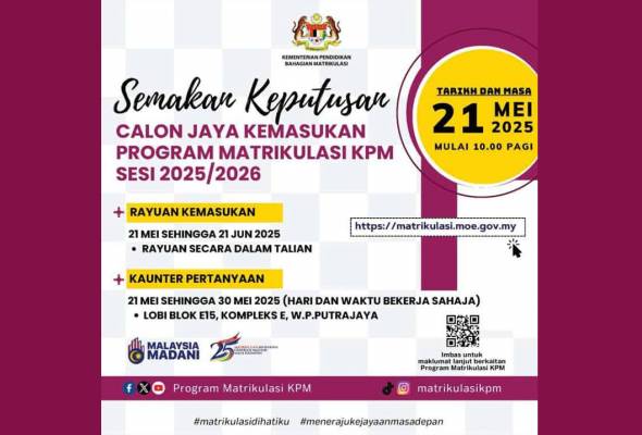 PUTRAJAYA: Keputusan calon yang berjaya ke Program Matrikulasi Kementerian Pendidikan (KPM) bagi Sesi 2025/2026 boleh disemak mulai hari ini, bermula pukul 10 pagi.
